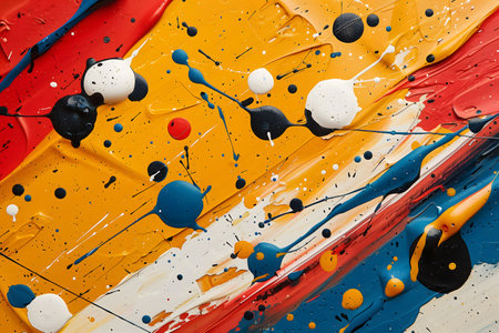 Abstract artwork features a vivid arrangement of multicolored paint splashes. Dynamic diagonal streaks and dots in hues of pink, yellow, orange and black contrast against a vibrant blue background. Suitable for creative projects, design elements, and decorative uses.