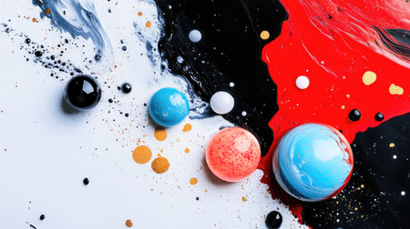This vibrant abstract artwork displays colorful paint swirls and decorative balls against a contrasting background, evoking creativity and imagination.