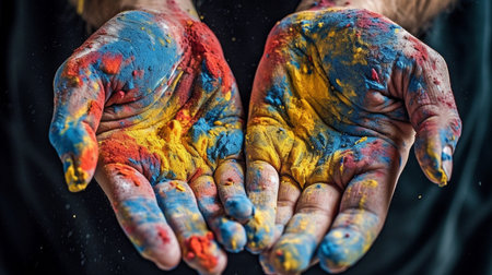 Powdered paint in various colors is all over one hand. GENERATE AI