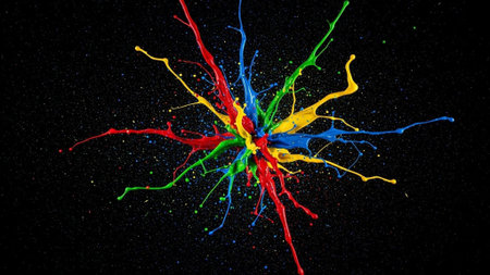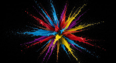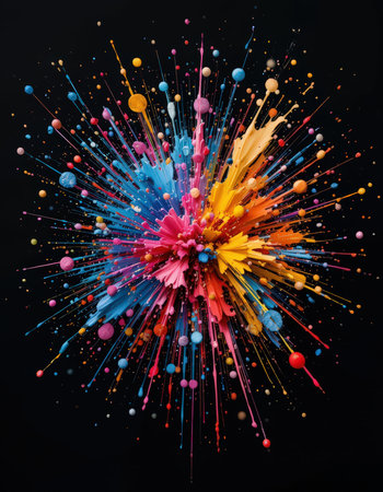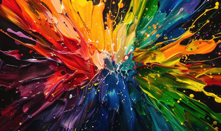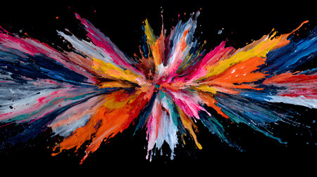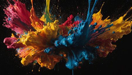 A dynamic explosion of vibrant, multi colored paint splashes against a stark black background, creating an abstract and energetic visual