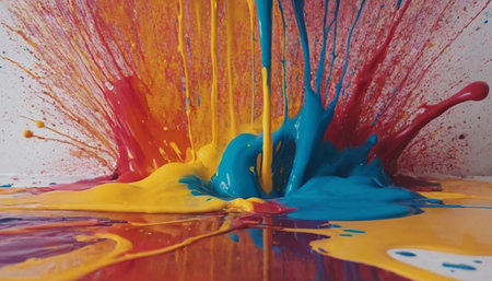 Dynamic Paint Splash Explosion in Motion A high-speed capture of vibrant acrylic paint splashing mid-air in bold primary colors, frozen