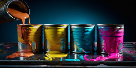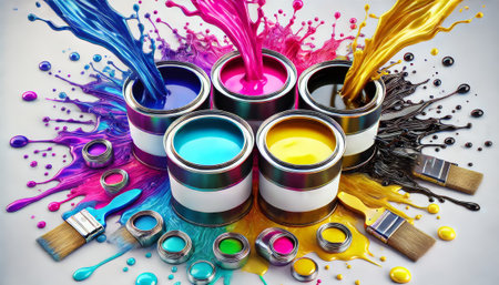 Four paint cans with cyan, magenta, yellow, and black colors with vibrant splashes