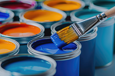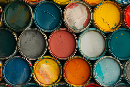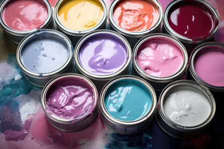 Colorful paint cans top view for diy projects and home improvement, artistic creativity concept