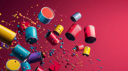 Dynamic explosion of colorful paint cans in mid-air, creating a vibrant splash on a striking red background. Generated A.I.