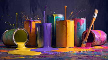Realistic 3D illustration of open paint cans spilling bright liquid colors, paintbrush nearby, artistic mess, vibrant and creative scene, high quality render