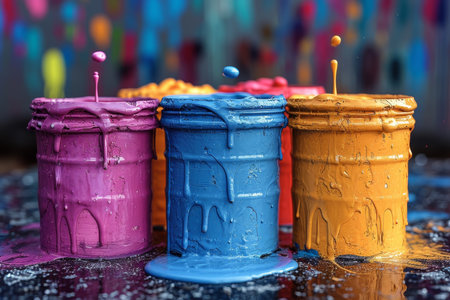 Diverse array of brightly colored paint cans arranged on a vibrant and dynamic background