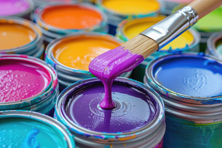 Variety of open paint cans on vibrant multicolored background for artistic projects