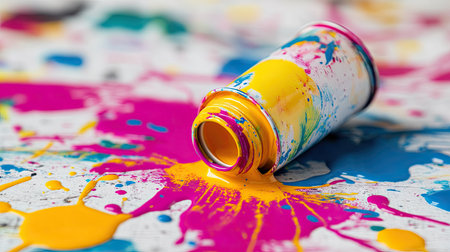 A brightly colored spray paint can tipped over, spilling paint onto a white surface.