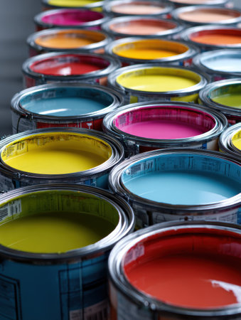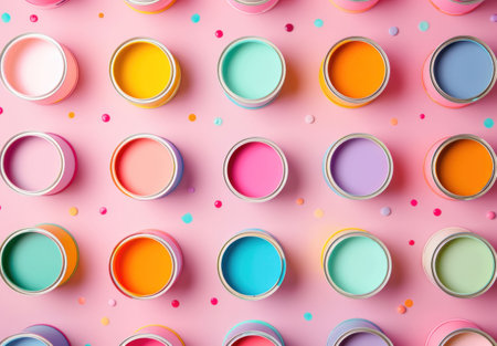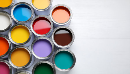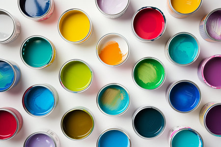 Colorful paint cans top view for diy projects and home improvement, artistic creativity concept