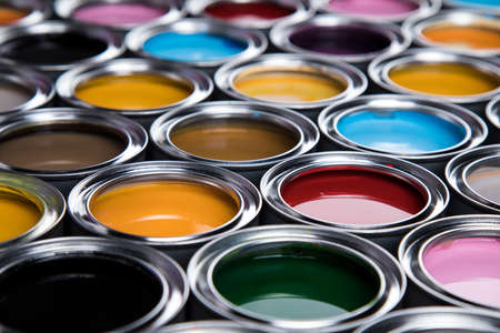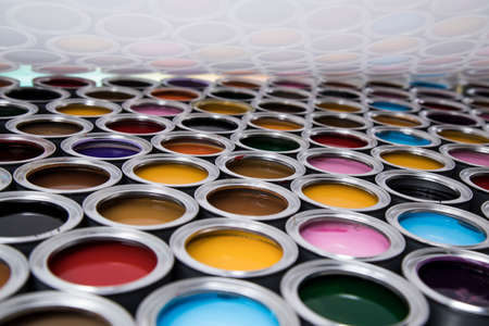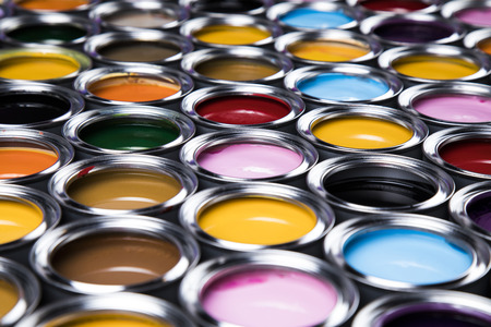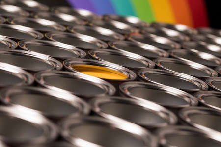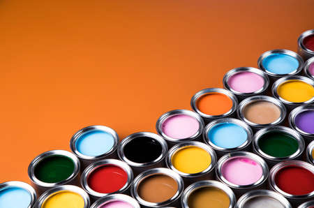 Colorful paint cans for drawing and painting. Abstract background and texture.