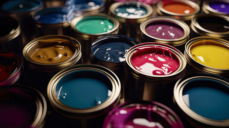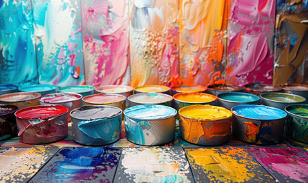 Variety of open paint cans on vibrant multicolored background for artistic projects