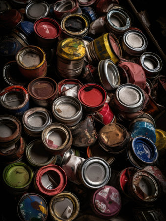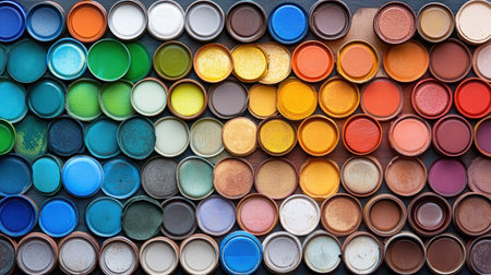 a large collection of paint cans in various colors are meticulously stacked to form rich in pattern and texture, spotlighting the arrangement of these can-shaped painting accessories