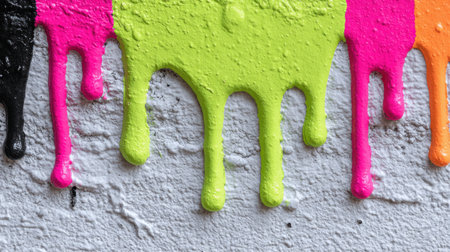 The image features vibrant paint drips in multiple colors, including pink, green, and orange, against a textured white background. The composition highlights the flowing paint in an abstract manner. This colorful design can be used for artistic, decorative, or creative projects and would be suitable for various commercial purposes.