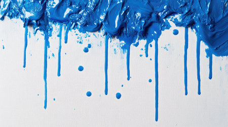 Abstract top view of blue paint drips on a white canvas, forming random patterns with contrasting textures