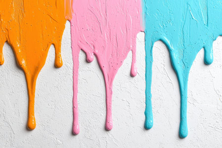 Colorful paint drips cascade down a soft pastel backdrop, forming an artistic display. Vibrant hues of pink, orange, and turquoise blend harmoniously, showing creativity and texture.