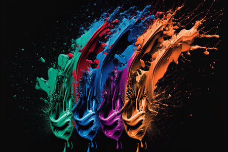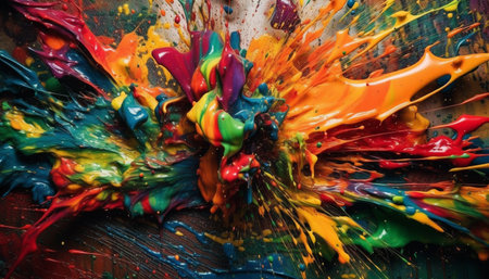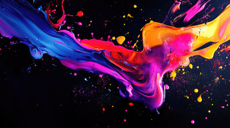 A stunning display of colorful paint splashes creates a dynamic and energetic abstract art piece. The vibrant colors against a dark background evoke excitement and creativity.