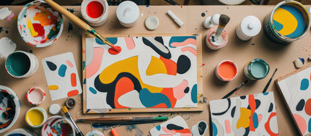 An artistic sticker mockup featuring abstract designs, arranged on an artist's workspace, surrounded by paint and brushes, ideal for creative brands, --ar 16:7 --v 6 Job ID: 8b86f163-5148-4973-9a72-11b9b48f430a