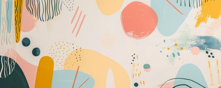 Modern art mural wallpaper background with a mix of organic shapes and geometric patterns in pastel colors, creating a light and playful composition.