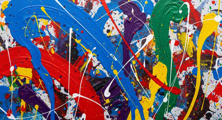 This vibrant abstract expressionist wallpaper showcases a riot of colors with bold splashes and dynamic patterns, ideal for contemporary interior design accents in any space.