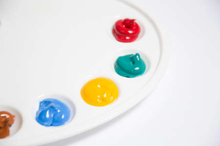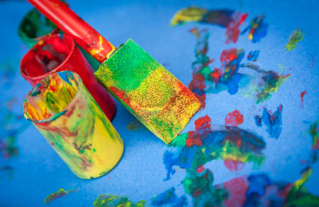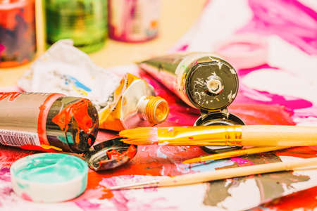 Painter workplace with tubes of multicolor oil paint and paintbrushes on painted paper close up.