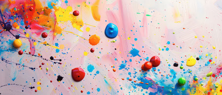 A group of multicolored paint splattered in vibrant red, blue, and yellow hues on a white surface. The paint appears to be randomly splattered, creating a dynamic and colorful composition.