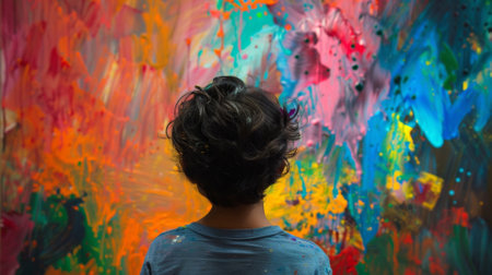 A young artist stares intently at the vibrant canvas before them lost in thought as they ponder the next stroke of paintbrush. .