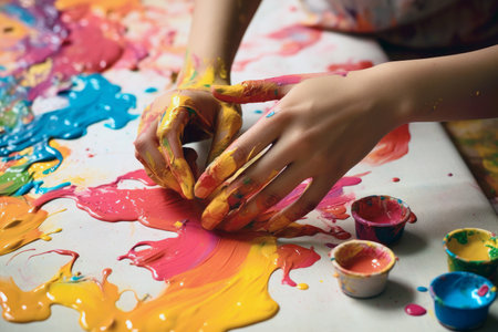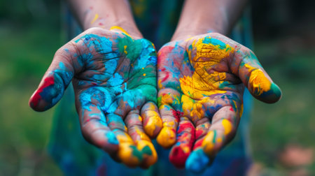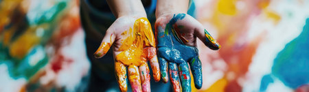 Hands covered in colorful paint against a blurred background. Concept of art, creativity, and childhood.