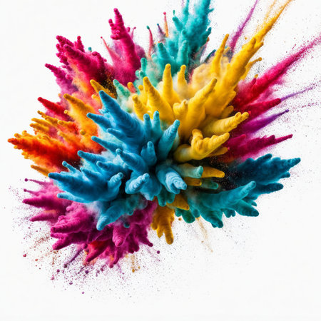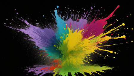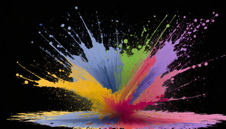 Vibrant explosion of multicolored powder against a black background, creating a dramatic burst of energy