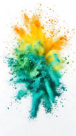 Dynamic image showcasing a vivid explosion of yellow, green, and blue powder. The colorful particles create a captivating burst against the clean white backdrop, perfect for abstract designs.