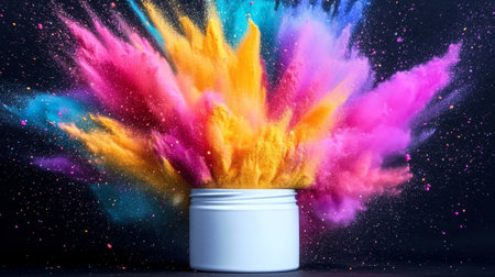 Vibrant Explosion of Holi Powder Pigments Bursting from a White Container in Studio Setting