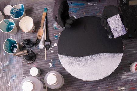 arts and craft hobbies concept, blue and black acrylic painting with colors in plastic cups and mixed painting tools next to it while the work is in progress