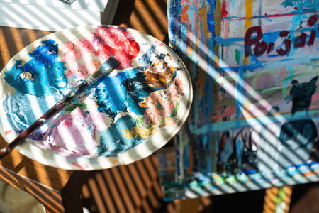 art palette with paint and brushes, close up. Top view with empty space. workplace for creativity. home teaching concept drawing.