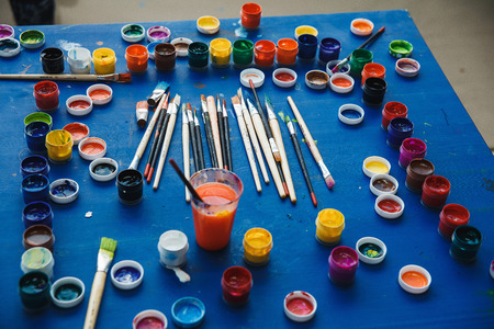 Paintbrush and watercolor paint, palettes on the table smear the color,education and art object,top view