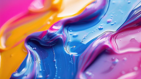 Bright and vivid paint colors blend together, showcasing swirls of pink, turquoise, yellow, and purple. The texture is smooth and glossy, highlighting the artistic expression.
