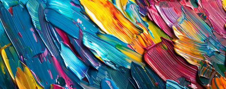 A vibrant abstract background featuring bold and colorful paint strokes. This artwork showcases dynamic patterns and fluid textures in a lively composition.