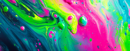 A vibrant burst of neon paints in electric green, pink, and blue, with a glossy, high-shine finish that enhances their brightness and creates a dynamic visual.