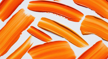 A top-down, close-up view captures multiple brush strokes of vibrant orange paint scattered across a bright white surface. The strokes vary in size, length, and direction, creating a dynamic, abstract pattern. The texture of the paint application is evident, with visible brush marks and slightly feathered edges on some strokes, giving a sense of movement and artistic expression. The high contrast between the warm orange and the stark white background results in a modern and clean aesthetic.