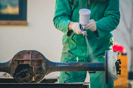 Man with automotive air spray gun in action during the restoration of a vintage car. Applying first base layer of paint onto an old big differential unit or rear axle.