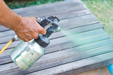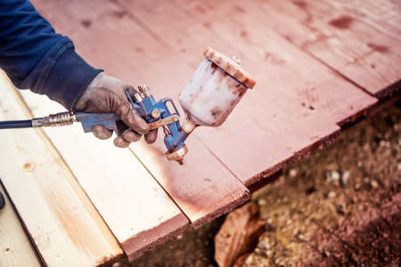 close-up of spray gun getting paint over timber. Young painter renovating