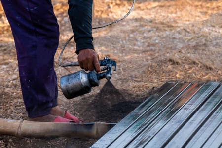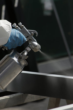 spray painting metal work, steel painters man with a spray gun in hand, laborer or labor day concept, copy space