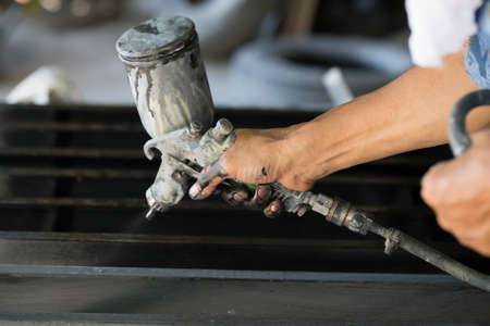 Close up of a spray paint gun and worker hand