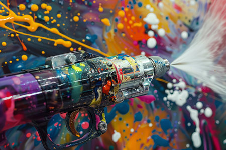 Paint spray gun spraying white paint creating splatters on colorful canvas