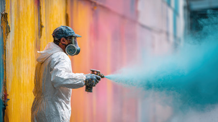 A person in protective gear spraying mist in vibrant environment. scene conveys sense of safety and precision in colorful atmosphere
