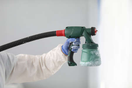 Master paint wall with white paint. Male hand in protective suit hold spray gun in his hand close up.