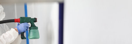 Repairman in gloves painting wall in white with spray gun closeup