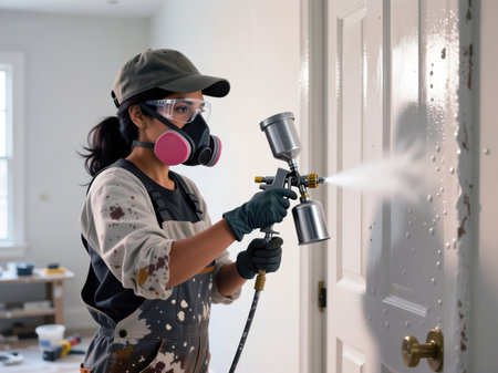 Female painter in respirator and safety glasses using spray gun on white door.