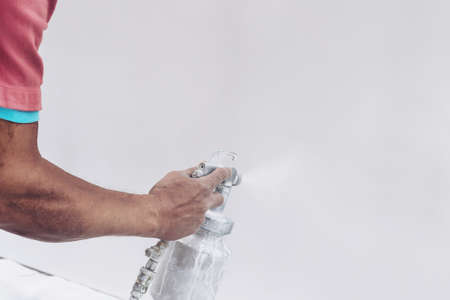 Close-up of man hands hold the tool the paint spray. Man painting with airbrush apartment repairment. House remodel. Spray paint work