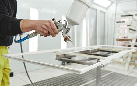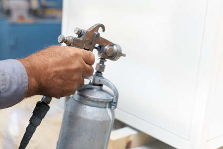 Painting of a metal product. A workshop worker holds a compressor spray gun in his hand and paints the Cabinet white. The hand with the tool close up