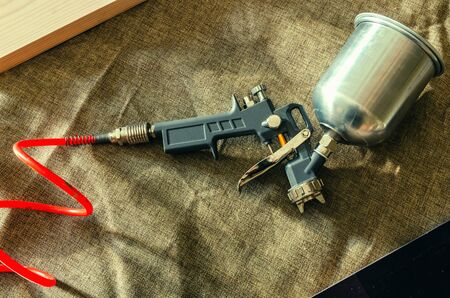 spray gun on wood table. in auto service. used for industrial painting and coating.