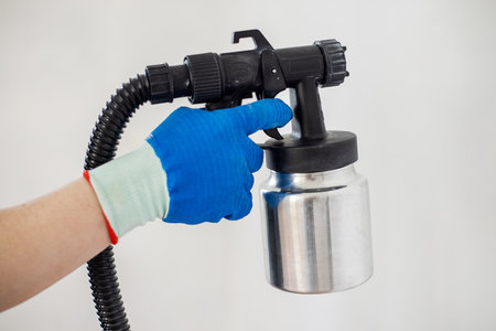 Gloved hand of master holds spray gun